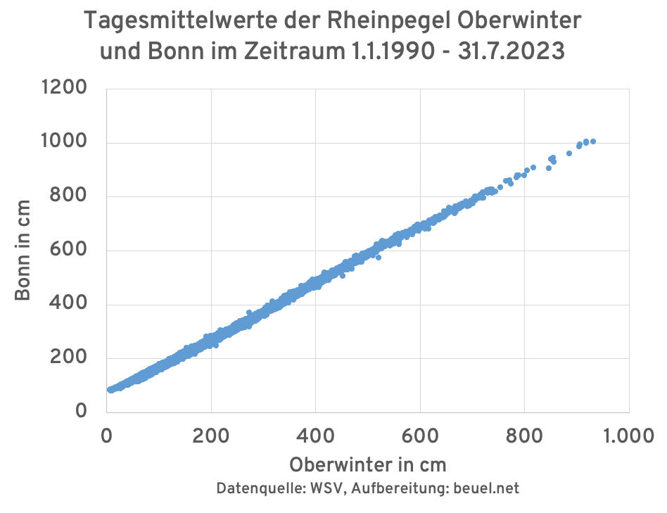 Grundsätzlich sind Pegel an verschiedenen Punkten in einem Gewässer nicht ohne Weiteres vergleichbar. Dies ergibt sich neben der beschriebenen Gerinnehydraulik auch aus dem reinen Querprofil des Flussbettes, das ortsabhängig individuell ist. Leicht nachvollziehbar steigt der Pegel beispielsweise schneller an, wenn die gleiche Wassermenge auf eine steile Uferbefestigung trifft. So sind auch die Pegelstände zwischen Städten nicht unmittelbar zu übertragen. Hier spielt auch die zeitliche Verzögerung durch die Distanz sowie Zu- oder Abflüsse von weiteren Gerinnen eine erhebliche Rolle. Ein Interessanter Fall besteht für die Pegel Oberwinter und Bonn. Auf dem rund 16 km Rheinabschnitt von Oberwinter bis Bonn besteht kein kontinuierlicher Zufluss durch einen signifikant großen anderen Fluss. Somit kann die Hypothese aufgestellt werden, dass die Korrelation zwischen den beiden Pegeln näherungsweise bestimmbar ist.
