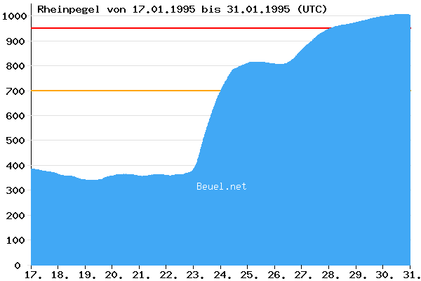 Dort findet sich ein klarer Spitzenreiter: am 23. Januar 1995 befand sich um Mitternacht der Pegel wie in den Tagen zuvor auch in einem Bereich von unter