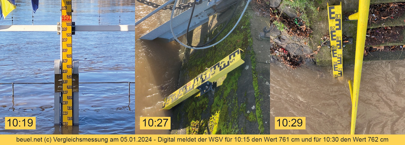 Im Rahmen des Hochwassers am 05.01.2024 wurde eine stichprobenartige Vergleichsmessung durchgeführt. Dazu wurden alle drei zu diesem Zeitpunkt aktiven Pegellatten innerhalb von 10 Minuten abgelesen. Dies sind die Ergebnisse dieser Stichprobe: