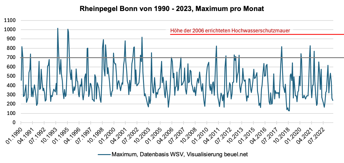 In dieser Grafik haben wir die Pegelwerte von 1990 bis 2023 pro Monat mit dem jeweiligen Maximum aufgetragen. Ab 2006 ist auch die Hochwasserschutzmauer in rot eingetragen, mit ihrem Orientierungswert von 950 cm.